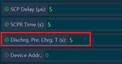 Standard staat Pre-Charge functie uit, de parameter “Dischrg. Pre. Chrg. T (S): 0” zet deze op 5 seconden. In de BMS zit een 10Ohm / 10W weerstand, bij het aanzetten zal dan de omvormer gedurende 5 seconden worden geladen via de weerstand om hiermee de condensatoren te laden.