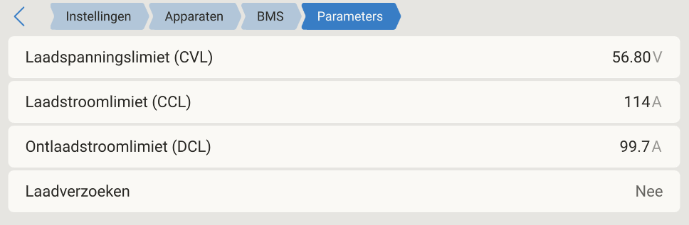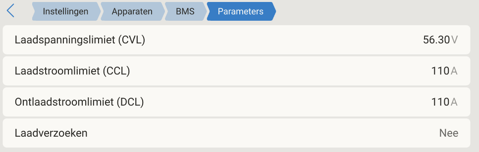Tijdens Bulk en Absorptie fase zal de BMS als CVL de RCF waarde via de CANbus versturen (mijn accu heeft 16 cellen, 16 x 3,550 = 56,8 volt) dus de waarde die in het parameter scherm staat is juist.