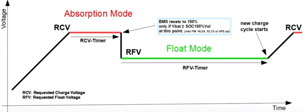 Wanneer de BMS de accu als vol heeft gedetecteerd, zal deze de float spanning “RFV” via de CANbus versturen (16 x 3,375 = 54 volt).