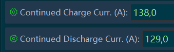 “Continued Charge Curr. (A):” > De maximale laadstroom, bij mij 120A.