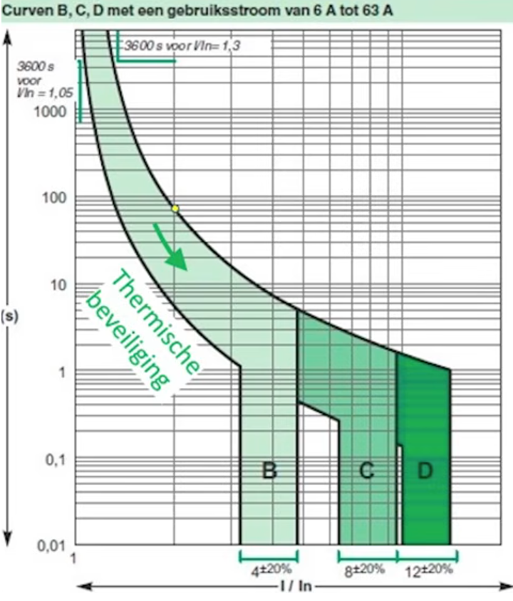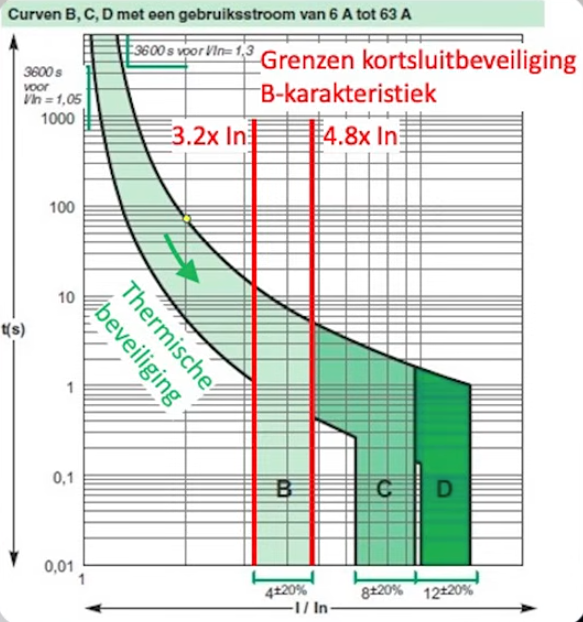 Een Installatie automaat met de B-karakteristiek heeft kortsluit beveiliging tussen de 3,2x en de 4,8x, dat is bij een B16 tussen 51,2A en de 76,8A en bij een B32, tussen de 102,4A en de 153,6A.