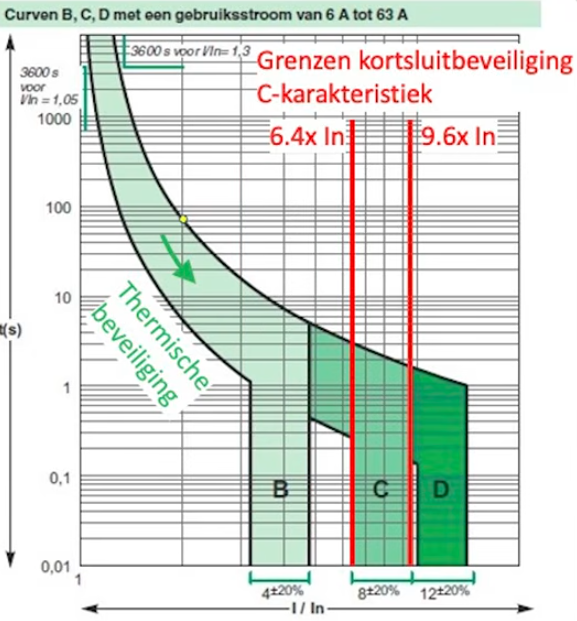 Een Installatie automaat met de C-karakteristiek heeft kortsluit beveiliging tussen de 6,4x en de 9,6x, dat is bij een C16 tussen 102A en de 153,6A en bij een B32, tussen de 204,8A en de 307,2A.