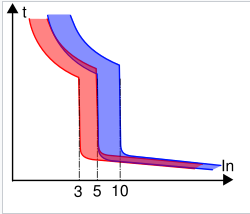 Curve B: lage magnetische drempel ca. 3 à 5 × In