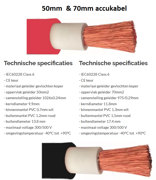 De voorgeschreven kabels hebben een kern-diameter van minimaal 50mm2. Dit is niet de omtrek van de kabel maar van de gezamenlijke kernen. Victron adviseert voor de Multiplus-II 5000 een kabel van 70mm2 kern-diameter.