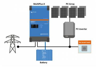 Wanneer er al een PV installatie is, bijvoorbeeld een SolarEdge, wil je dat deze niet meer direct aan het Net (Grid) hangt, immers zou dan de PV installatie uitvallen wanneer de net spanning boven de 252 komt of wanneer het Net wegvalt. Als je de PV installatie achter de Victron hangt, op port “AC OUT 1” dan zal bij uitval net of een te grote netspanning de verbinding met het net uitvallen en de installatie in eiland-mode (Zelfstandig) worden geschakeld. de PV installatie word dan gebruikt om de de eigen energie op te wekken en de accu’s te laden. Wanneer de accu ’s vol zijn zal de Victron doormiddel van de frequentie te verschuiving de PV installatie de opwekking laten verminderen of uitschakelen.