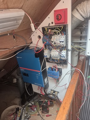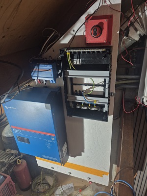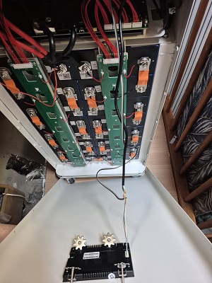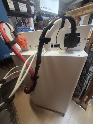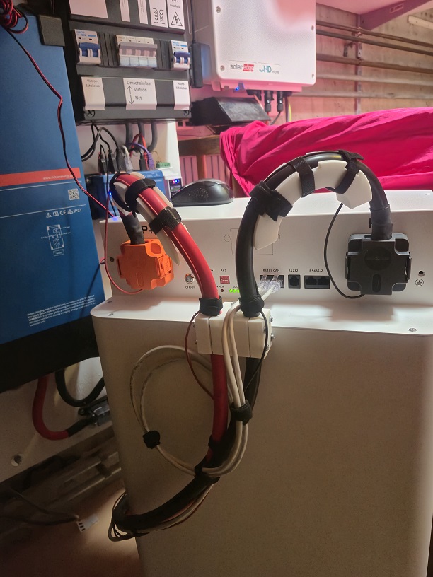 Behalve de stroom-kabels van 70mm2 lopen hier ook 2 draden welke de spanning van de accu direct bij de accubak meet. Ook zie je de draden naar de Can en RS485 aansluiting.