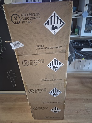 De 4 dozen met daarin 4x een MB31 single stud Grade-A van Eve met minimaal 314Ah. Na opvragen van de meetlijst bij Nkon, kwam het uit op een Accu systeem van 330Ah.