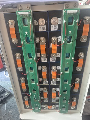 Eens in de zoveel tijd zal de BMS de cellen (die dit nodig hebben) hierover balanceren. Tevens zitten hier ook de 4 temperatuur sensoren op (zwarte draadjes) welke de temperatuur in de kast meten.