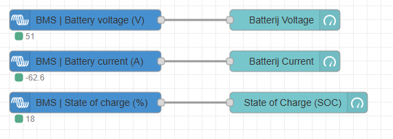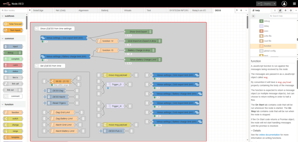 Mijn installatie staat op zolder en de Multiplus-II units maken best veel lawaai wanneer deze op volle kracht aan het werken zijn. Om in de nacht ze wat stiller te maken, laat ik deze in de nacht minder hard werken dan overdag, het Node-Red scriptje ziet er dan zo uit:
