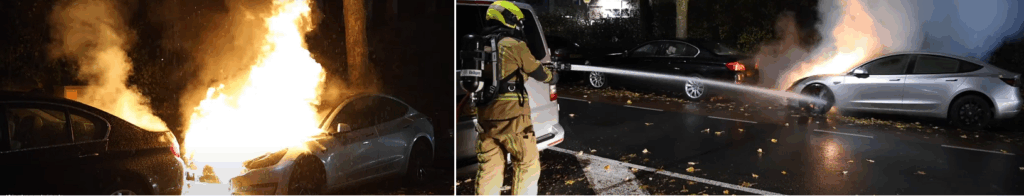 Hieronder een foto van een geparkeerde Tesla die spontaan in brand vloog.