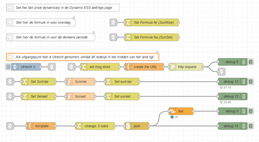 Ik heb hiervoor het volgende Node-Red script gemaakt, deze berekend op basis van jou GPS positie wat de zonsopkomst en zonsondergang is.